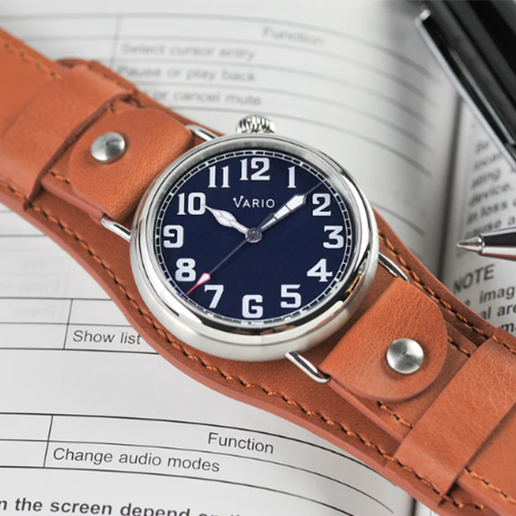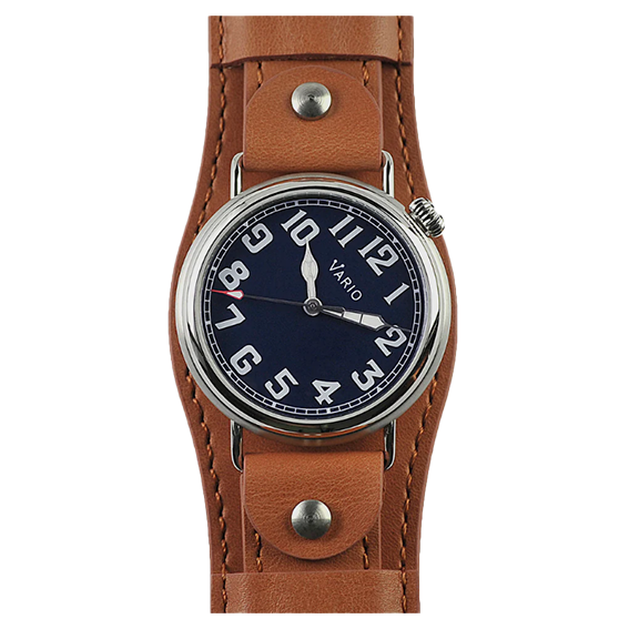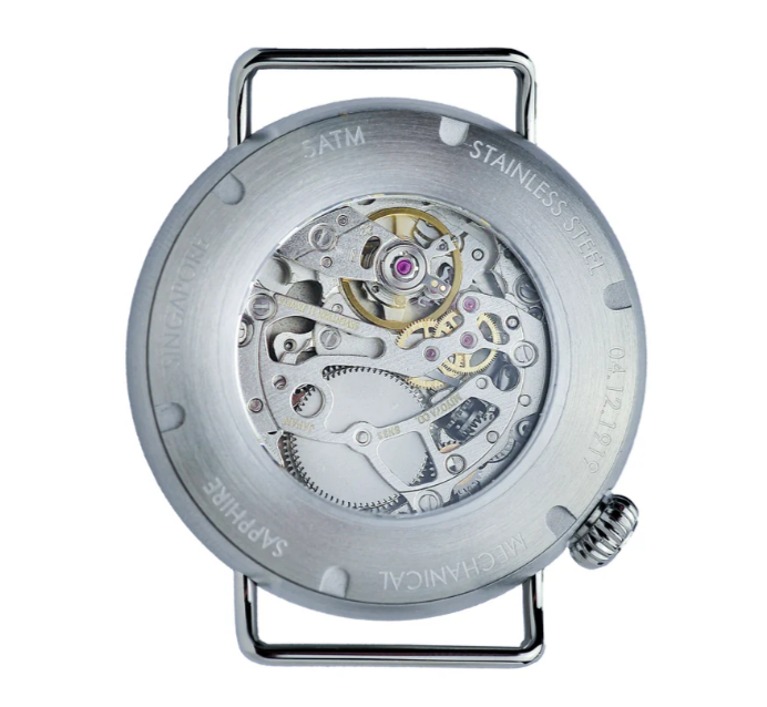 The 1918 Pilot is a re-imagined issue of a pilot's watch in the early 1900s. Its simple, cock-eyed dial provides perfect legibility for when one is navigating. It also features an exposed caseback showcasing the mechanical movement within. Straps are configurable based on preference.