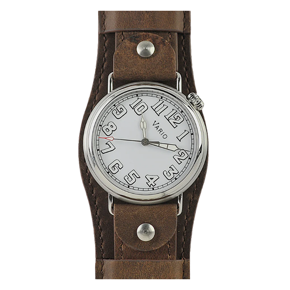 The 1918 Pilot is a re-imagined issue of a pilot's watch in the early 1900s. Its simple, cock-eyed dial provides perfect legibility for when one is navigating. It also features an exposed caseback showcasing the mechanical movement within. Straps are configurable based on preference.
